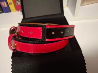 Elegante cinturón de piel con un diseño bicolor. - Combina el negro clásico con un vibrante toque fucsia. - Fabricado en piel de alta calidad.