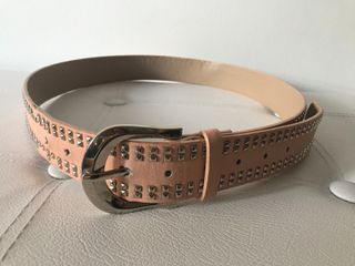 Cinturón en tono rosa pálido, con tachuelas plateadas a lo largo de los bordes. Solo ha sido usado una vez. - Medida: 110 cm. - Diseño con doble fila de tachuelas. - Hebilla metálica plateada.