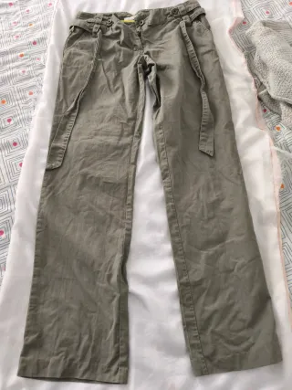 Pantalones largos de color verde oliva, con un diseño moderno y cómodo. - Cinturón a juego incluido. - Bolsillos laterales. - Cierre de botón y cremallera.