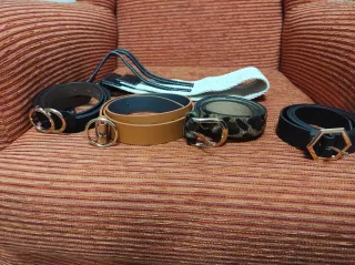 Conjunto de cinco cinturones con diferentes diseños y hebillas. - Cinturón negro con doble hebilla redonda. - Cinturón marrón con hebilla redonda. - Cinturón con estampado de leopardo y hebilla dorada. - Cinturón negro con hebilla hexagonal dorada. - Cinturón blanco tejido con detalles en negro.