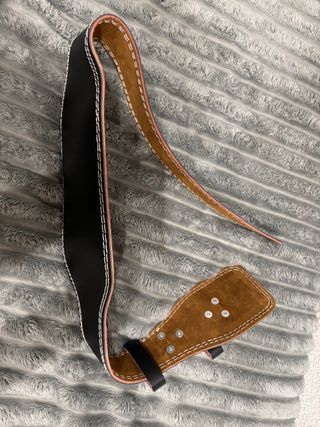 Cinturón de gimnasio con un diseño de dos tonos. - Exterior negro con costuras blancas y detalles rosas. - Interior de cuero marrón. - Hebilla metálica y cierre ajustable.