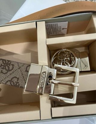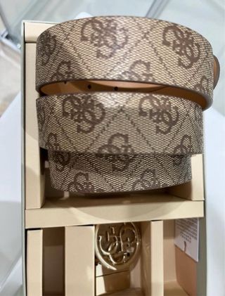 Cinturón reversible Guess con dos acabados. - Hebilla metálica dorada con logo. - Correa con estampado de monograma y reverso liso.