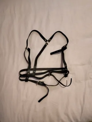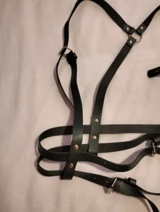 Arnés de polipiel con detalles en hebillas plateadas. - Diseño de tiras cruzadas. - Hebillas ajustables para un calce personalizado. - Material: Polipiel. - A estrenar.