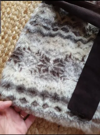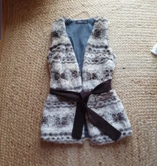 Chaleco de pelo sintético con un diseño estampado en tonos beige y marrón. Cuenta con un cinturón a juego para anudar a la cintura. - Estampado de inspiración nórdica. - Tejido suave y cálido. - Cinturón de tela incluido.