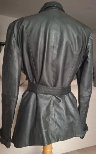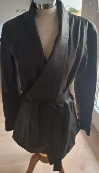 Elegante chaqueta de piel con un diseño cruzado y cinturón. - Material: Piel 90% - Color: Negro - Diseño cruzado con amplias solapas - Detalle de punto en las mangas - Incluye cinturón para ajustar la cintura