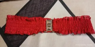 Este cinturón de encaje elástico añade un toque especial a cualquier atuendo. - Diseño de encaje con borde festoneado. - Hebilla metálica decorada con dos cuadrados. - Tejido elástico y fruncido.