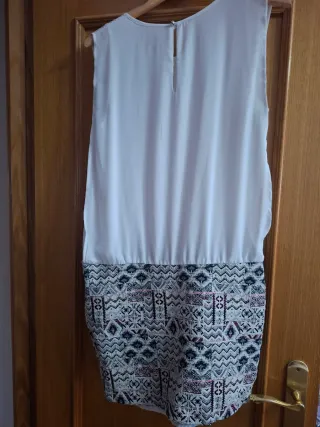 Vestido con efecto de doble capa, combinando un cuerpo liso con una falda estampada. Marca easy wear de El Corte Inglés - Cuerpo blanco con cuello redondo. - Falda con estampado geométrico multicolor.