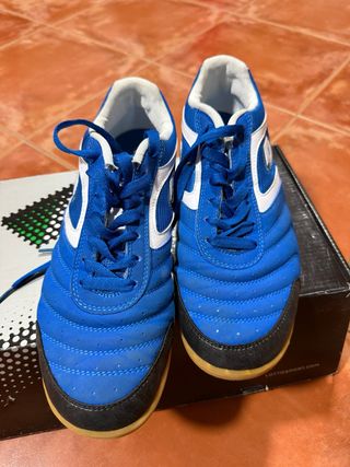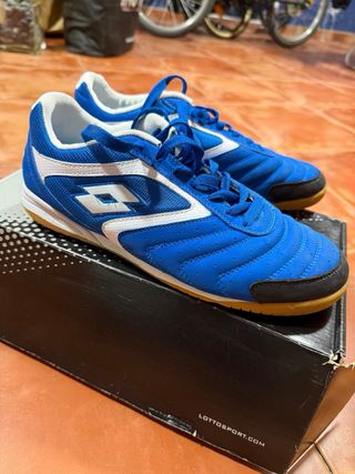 Zapatillas Lotto para fútbol sala en color azul con detalles blancos. Perfectas para jugar en pistas interiores. Nuevas, no se han usado. - Diseño deportivo. - Cierre con cordones. - Suela de goma.