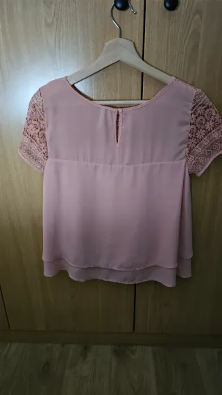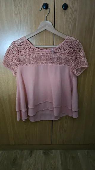 Bonita blusa de manga corta con un delicado encaje en la parte superior y detalle de volantes en el bajo. Su diseño es ligero y con un estilo muy femenino. - Encaje floral en cuerpo y mangas. - Doble capa en el bajo con efecto volante. - Manga corta con terminación de encaje.
