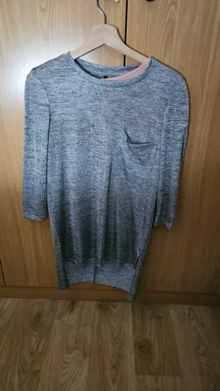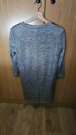 Camiseta de manga larga en tono plata. Presenta un detalle de pedrería en los hombros y un bolsillo en el pecho. - Hombros adornados con pedrería. - Bolsillo frontal. - Cuello redondo. -Parte de atrás más larga que la de delante.
