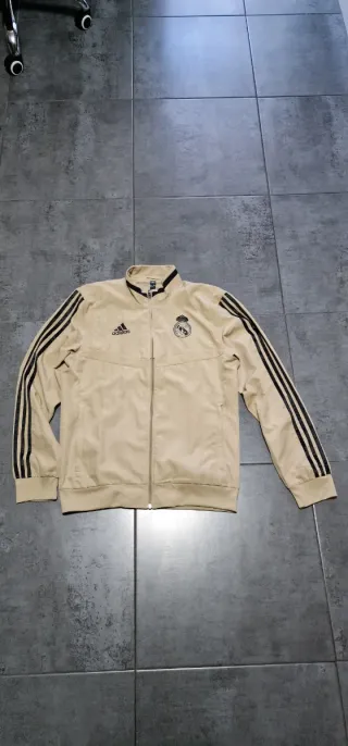 Chaqueta deportiva con el escudo del Real Madrid y el logo de Adidas color Beige y negro - Diseño con las tres franjas características de la marca en las mangas. - Cierre de cremallera frontal. Esta impecable como nueva poco uso Es original de Adidas hombre Talla S.. Medidas las teneis en las fotos