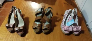 Elegantes zapatos de tacón para mujer.Mustang talla35 sin estrenar,los otros 2 pares talla 36 de Zara, una puesta cada uno.Lote40 euros,por separado Mustang 20, Zara 10, Zara 10,más gastos de envío - Diseño de tiras cruzadas. - Detalle de lazo en la puntera. - Tacón de cuña.