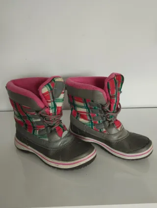 Botas de nieve con un divertido diseño a cuadros, perfectas para mantener los pies calientes y secos en los días fríos. - Diseño a cuadros en tonos rojos, verdes y blancos. - Forro interior rosa suave. - Cierre con cordones grises. - Suela resistente.