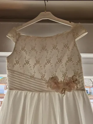 Vestido de comunión de la marca María Luisa. Un diseño elegante y delicado. - Cuerpo de encaje floral. - Fajín con detalle de flores. - Falda de tul. Talla 140