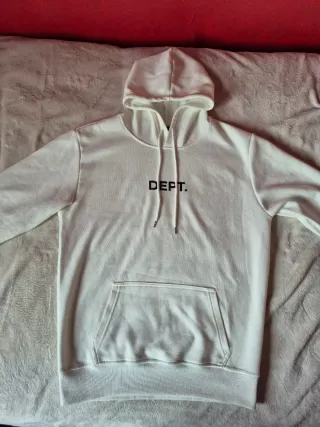 Sudadera blanca con un diseño sencillo y moderno. - Logo DEPT. en el pecho. - Bolsillo canguro delantero. - Capucha con cordones ajustables. - Puños y bajo acanalados. Usado pocas veces. En perfecto estado sin ninguna mancha ni ningun desperfecto.