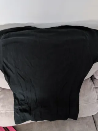 Camiseta negra con un diseño llamativo y moderno. - Estampado LIVE YOUR STYLE con detalles brillantes. - Mangas cortas con flecos. - Bajo con flecos largos. - Cuello redondo.