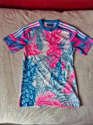 Camiseta de manga corta con un vibrante estampado tropical. - Diseño con piñas y hojas exóticas. - Detalles de las icónicas tres rayas en las mangas. - Cuello redondo. - Material transpirable Camiseta en perfectas condiciones sin apenas uso.