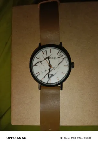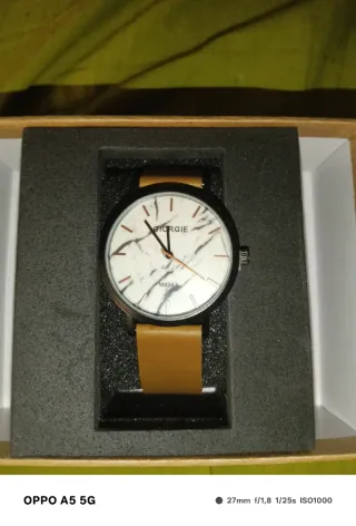 Elegante reloj con diseño de mármol y correa de cuero. - Esfera con patrón de mármol blanco y vetas grises. - Correa de cuero marrón. - Agujas y marcadores de hora en tono cobre.