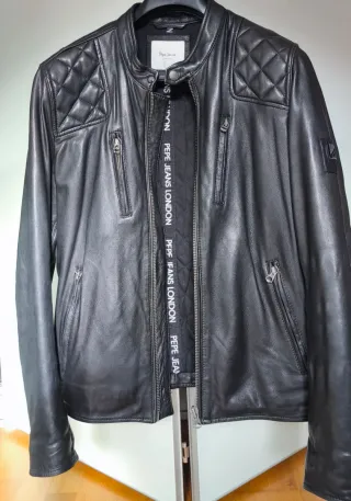 Vendo espectacular chaqueta de la marca Pepe Jeans London, modelo Pearson original, en color negro. Es un modelo tipo "Cafe Racer" con un diseño atemporal y muy versátil. Detalles destacados: Talla: M 100% de suave piel de cordero. Diseño: Paneles acolchados con costuras de diamante en los hombros. Estilo: Cuello tipo banda con cierre de botón a presión. Detalle premium: Cinta interior con el logo de la marca a lo largo de la espalda. Bolsillos: 4 bolsillos exteriores frontales con cremallera. Y dos interiores. Estado: Prácticamente nueva.Sin marcas.