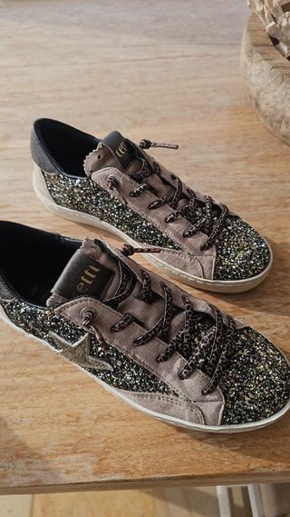 Zapatillas de la marca Cetti con un diseño llamativo. - Acabado con glitter en tonos dorados y beige. - Detalle de estrella lateral. - Cordones con estampado animal print.
