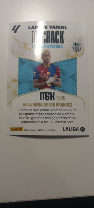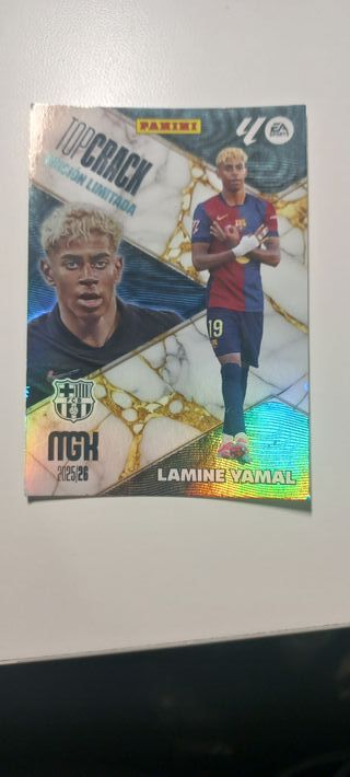 Carta coleccionable de Lamine Yamal de la colección Top Crack de Panini. - Edición limitada. - Incluye el escudo del FC Barcelona. - Diseño con detalles dorados y efecto holográfico.