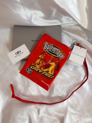 Bolso tipo clutch de Balenciaga con un divertido diseño inspirado en un paquete de patatas fritas. - Diseño Spicy Chili Potato Chips. - Cierre de cremallera. - Detalle de pimiento picante y llamas.