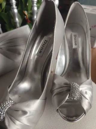 Elegantes zapatos de tacón de la marca Dune. - Color plateado. - Diseño con lazo y pedrería en la punta. - Tacón de aguja.