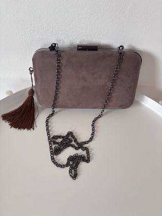 Elegante bolso de mano tipo clutch, perfecto para ocasiones especiales. Su diseño combina un acabado aterciopelado con detalles metálicos. - Cadena metálica desmontable. - Adorno de borla. - Cierre de clip metálico. - Tono topo