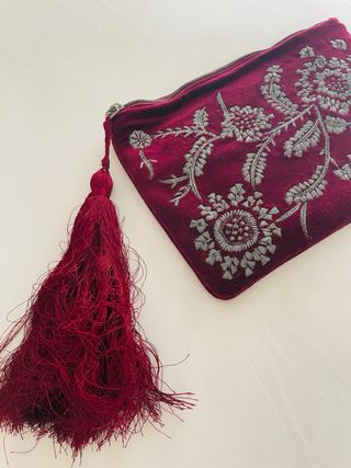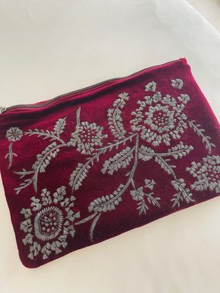 - Color granate intenso. - Diseño floral plateado. - Cierre de cremallera.