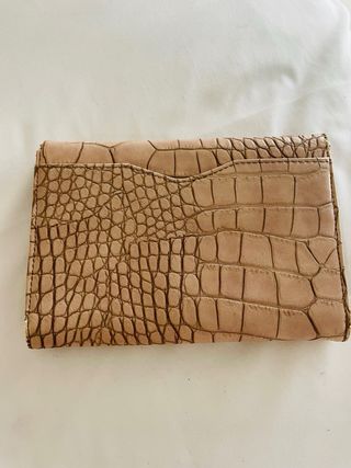 Elegante bolso tipo clutch con textura de piel de serpiente. - Color beige con detalles en dorado. - Marca Rose Nude. - Cierre de cremallera.