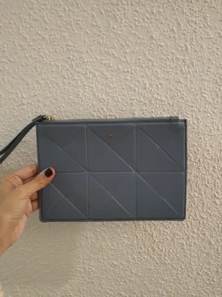 Elegante clutch de Purificación García con un diseño geométrico moderno. Su tono azul grisáceo lo hace muy versátil. - Diseño acolchado con líneas geométricas. - Cierre de cremallera. - Asa de mano.