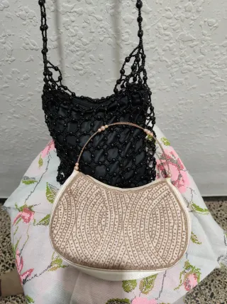 Conjunto de dos pequeños bolsos ideales para eventos o fiestas. - Bolso negro con detalles de cuentas y cadena. - Bolso beige con adornos de cuentas y asa.