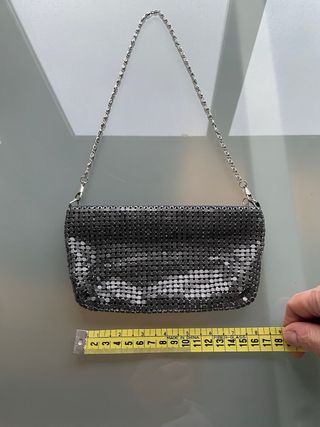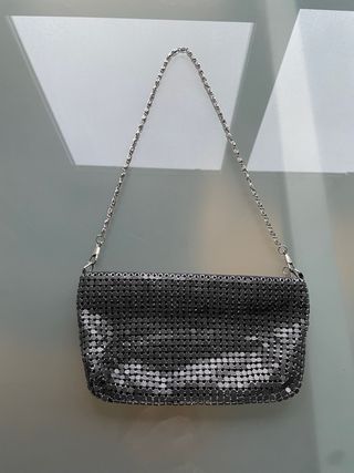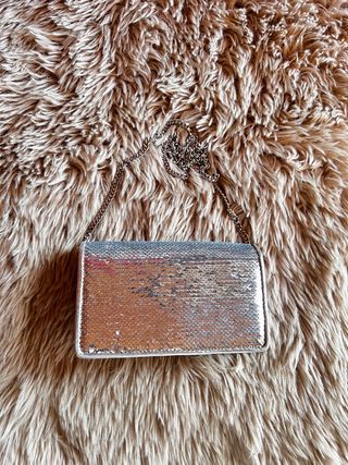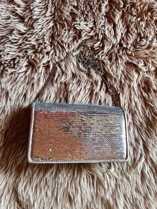 Bolso de Mango tipo clutch/mini bandolera en color plateado, con lentejuelas brillantes y cadena metálica a juego. En muy buen estado, usado una sola noche. Ideal para fiestas, eventos o looks de noche. Aporta un toque elegante y llamativo a cualquier conjunto. Ligero, práctico y fácil de combinar.