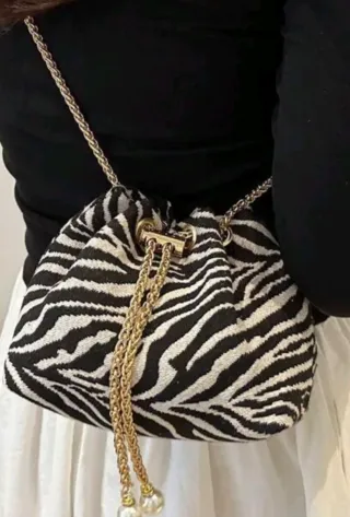 Bolso de mano con un llamativo estampado de cebra en blanco y negro. Perfecto para complementar tu atuendo de fiesta. - Diseño tipo saco. - Cadena dorada para llevar al hombro o cruzado. - Cierre de cordón con detalles metálicos.