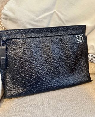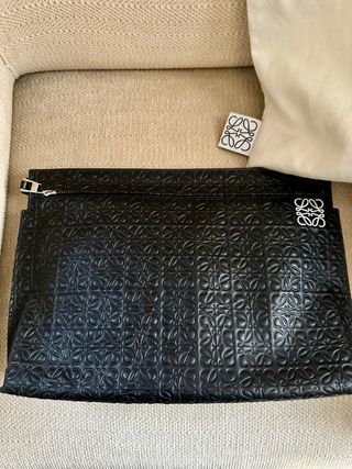 Elegante clutch de la marca Loewe en color negro. Presenta un diseño texturizado con el anagrama de la marca. - Diseño con relieve. - Cierre de cremallera.