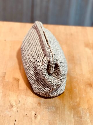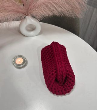 Elegante bolso tipo clutch en un llamativo color burdeos. - Diseño tejido a mano. - Asa superior integrada. - Forma curva y moderna.