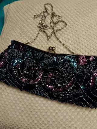 Clutch de satén con pedrería y lentejuelas Elegante bolso de mano adornado con pedrería y lentejuelas. - Diseño con motivos florales y espirales. - Cierre de boquilla metálico. - Cadena metálica para llevar al hombro. Usado en 2 ocasiones. 20 cm abertura 27 cm base 10 cm alto Posible entrega en Barcelona capital