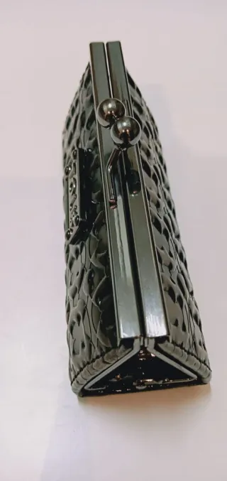 Monedero tipo mini clutch de la marca Tous. - Fabricado en vinilo brillante. - Diseño con relieve. - Cierre de boquilla metálica. - Relieve con ositos y corazones - Interior verde Ideal para coleccionistas o amantes de Tous que buscan modelos especiales que ya no se fabrican.