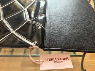 Elegante bolso de mano / clutch de la firma madrileña Teria Yabar. Diseño geométrico acolchado en charol negro con contraste en blanco. Es un artículo nuevo y conserva su etiqueta original (como se ve en las fotos). ⚠️ IMPORTANTE SOBRE EL ESTADO: Debido al almacenamiento, el material en algun borde tien un ligero roce/desgaste (ver fotos detalladas)