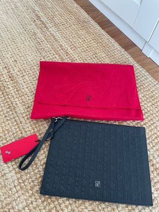 Elegante clutch de Carolina Herrera. - Diseño con monograma CH. - Incluye funda protectora roja. - Incluye etiqueta roja.