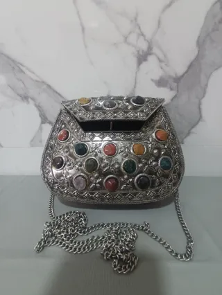 Elegante bolso clutch de estilo vintage con un diseño metálico y adornado con diversas piedras de colores. - Diseño metálico con incrustaciones de piedras. - Estilo vintage.. - Cadena metálica para llevar al hombro.