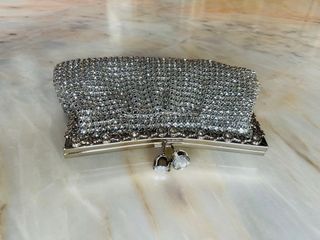 Elegante bolso de noche tipo clutch completamente cubierto de pedrería brillante, cristales muy brillantes que crean un efecto espectacular a la luz, estilo joya. Cierre metálico tipo vintage con detalle de cristales у cadena larga para llevar al hombro o cruzado. A pesar de su tamaño elegante, un iPhone Pro Max cabe perfectamente en el interior, junto con lo esencial (llaves, tarjeta, labial). Comprado en Italia, Milán Sin estrenar! - Cubierto de pedrería plateada. - Cierre de broche metálico.
