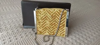 Elegante bolso de mano tipo clutch NUEVO, ideal para eventos especiales. Su diseño satinado y los pliegues frontales le dan un toque sofisticado. Medidas: 25x11x5 cm. Posibilidad de entrega en mano en Madrid, Valladolid y Santander. - Cierre metálico. - Cadena plateada desmontable. - Incluye etiqueta original.