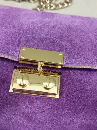 Elegante bolso tipo clutch de piel. - Color morado (precioso) - Cierre Click - Cadena metálica para llevar al hombro o cruzado. Made in Italy.