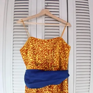 Vestido largo de fiesta con un diseño vibrante y un bolso tipo clutch a juego. - Estampado llamativo en tonos naranja y amarillo. - Detalle de flores y volutas en la parte inferior. (Pequeña cola) - Incluye un bolso de mano a juego. -Una sola puesta + limpiado en tintorería.