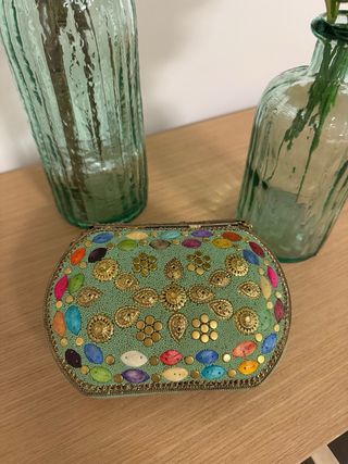 Elegante bolso de mano tipo clutch, adornado con detalles joya y piedras de colores. - Diseño llamativo y festivo. - Acabado con detalles metálicos dorados.