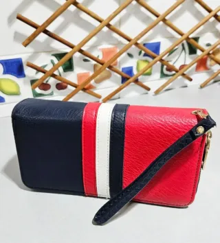 Monedero tipo clutch con múltiples compartimentos. Diseño bicolor en negro y rojo. Cierre de cremallera. Incluye correa de mano. En perfecto estado.