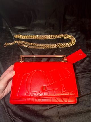 Elegante clutch de la marca Carolina Herrera. - Diseño Insignia. - Acabado en piel roja. - Detalles metálicos dorados.