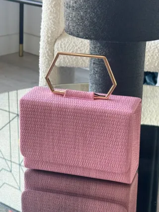 Clutch de fiesta acolchado en color rosa, asa dorada y cadena extraíble.