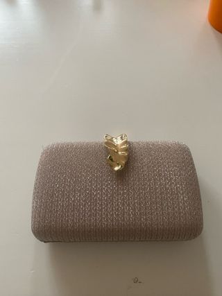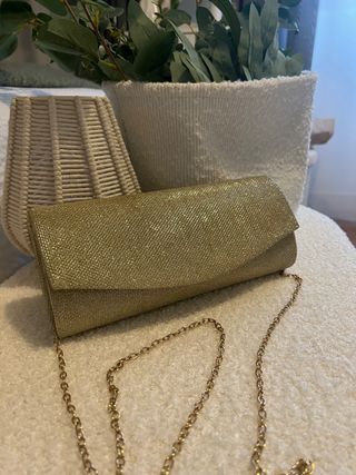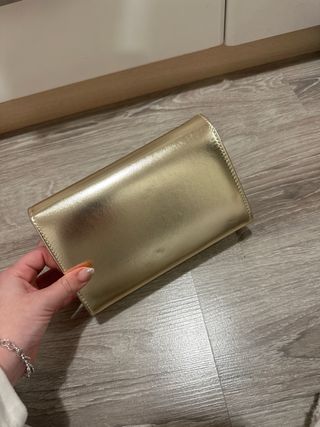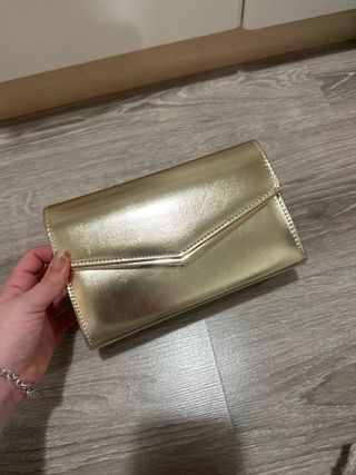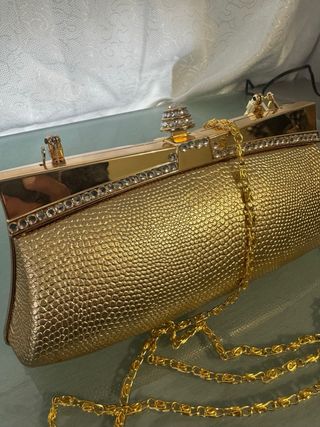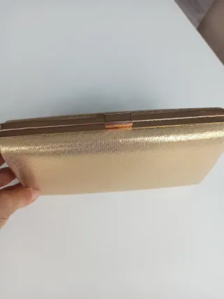 Elegante bolso de mano en tono dorado, perfecto para ocasiones especiales. - Acabado metálico brillante. - Cierre de clip. - Diseño rígido tipo clutch. - Tiene un pequeño rasponcito, se ve en una de las fotos.